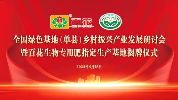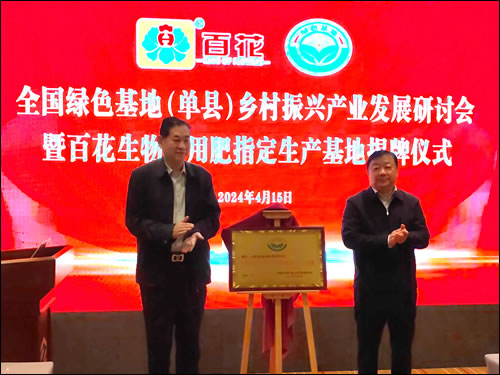 2024年4月15日,全国绿色基地(单县)乡村振兴产业发展研讨会在单县中领国际酒店召开,同时为山东百花生物集团有限公司举行“全国绿色农业产业专用肥指定生产基地”揭牌仪式。